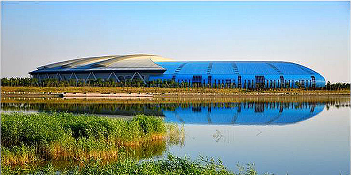 项目位于黄河入海口山东省东营市,右半部屋盖采用了跨度148米的张弦焊接球节点抽空四角锥网架结构,为国内跨度最大的张弦网架结构建筑。