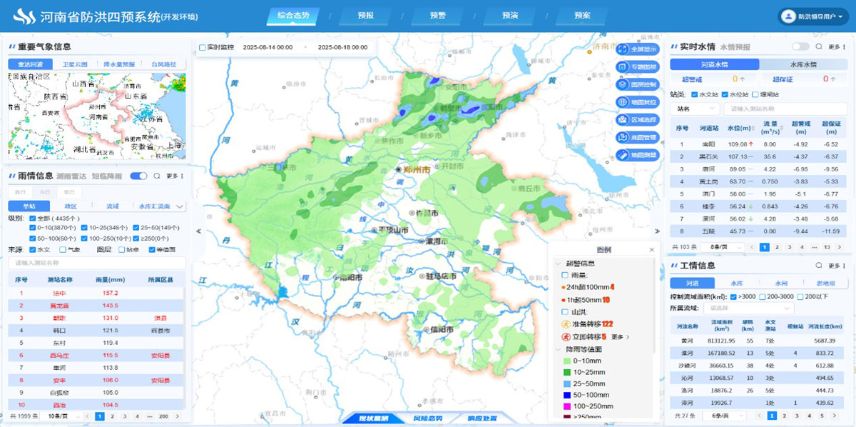 聚焦防汛核心业务,建设综合态势、预报、预判、预警、预演、预案模块,全面支撑从“雨水情监测预报-风险精准定位-影响综合研判-科学调度处置”的全链条防汛业务决策体系,实现洪水预报调度在数字场景中的动态交互、实时融合和仿真模拟,推动已建项目统一管理,在建项目统一标准,规划项目统一框架,实现河南全省数字孪生水利业务全链接,为各流域水利工程安全运行和优化调度提供超前、快速、精准的决策支持,全面提升全省防汛工作的整体效能与决策水平。