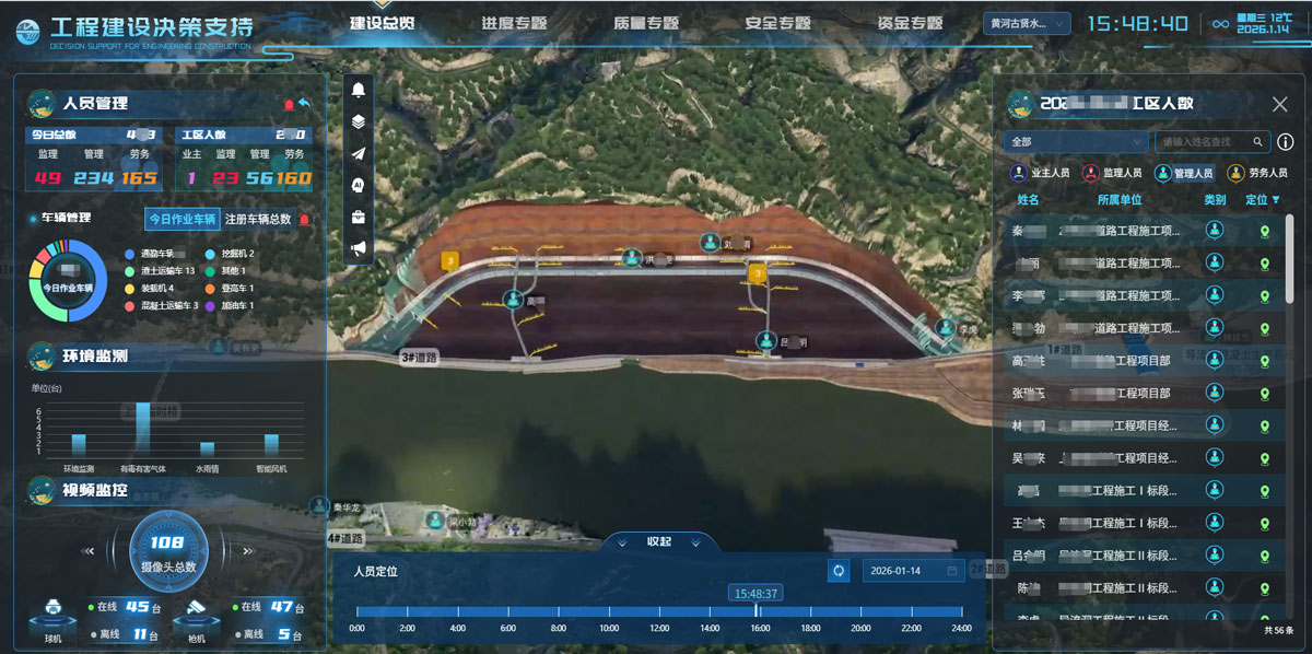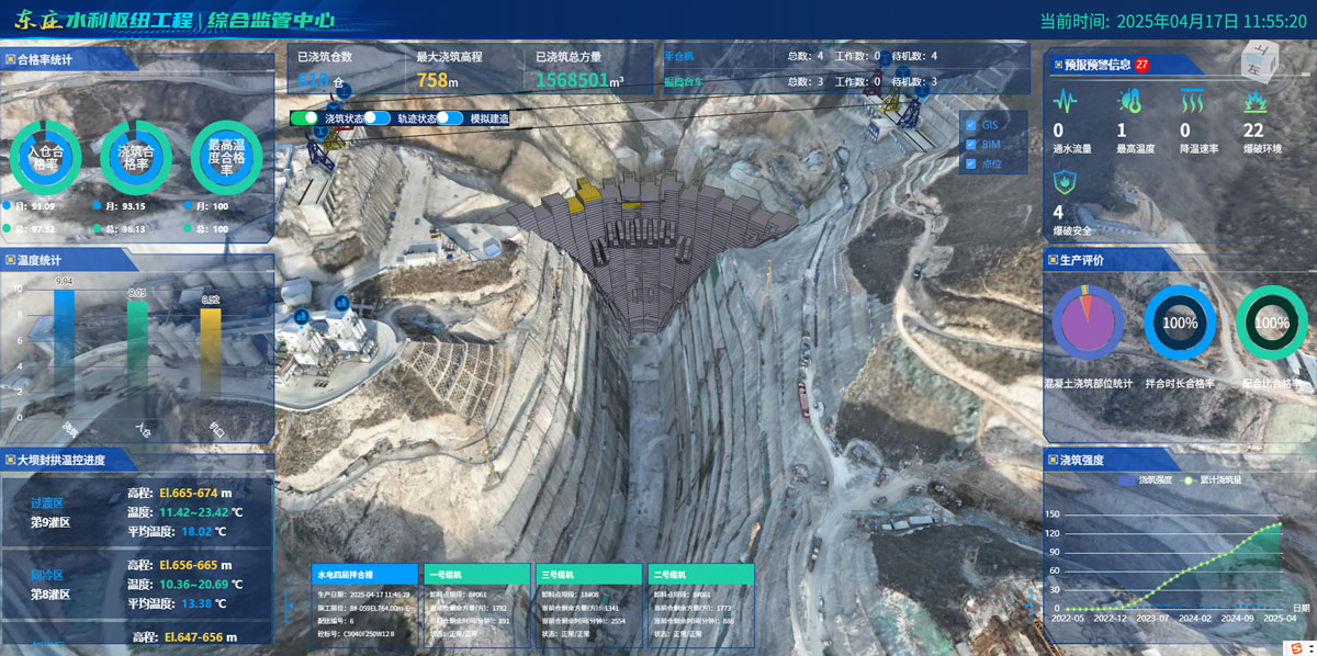 东庄水利枢纽信息化建设主要围绕大坝主体工程浇筑应用场景,基于大坝1139个仓面BIM精细化模型,融合智能监控感知数据,开展从混凝土拌合生产、运输、平仓、振捣、温控、验评、质检等生产环节进行全要素、全空间、全过程的智能化闭环管控。